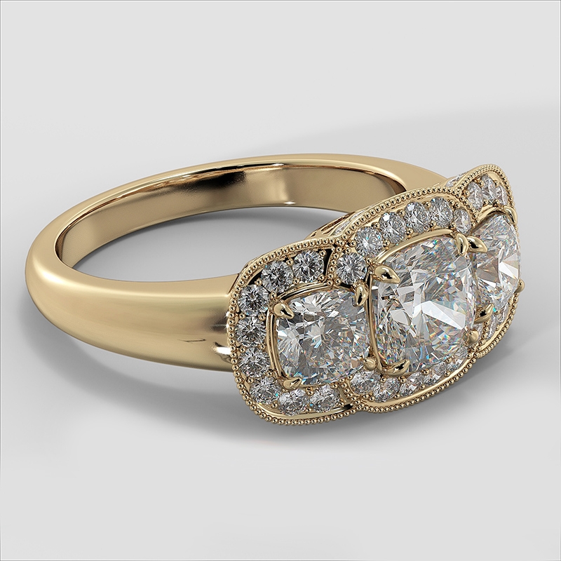 Diamond Engagement 3Stone Ring 14k Yellow Gold Cushion Semi Mount Halo Band 1.05Ct.