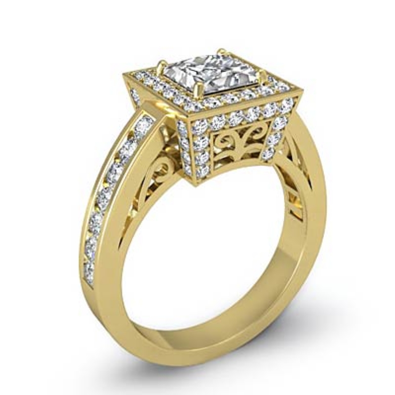 Channel Set Halo Filigree style Engagement Ring, center is Princess shape Diamond Report by GIA, J Color & VS1 clarity, Made in 14k Yellow Gold (1.93 ct. tw.)