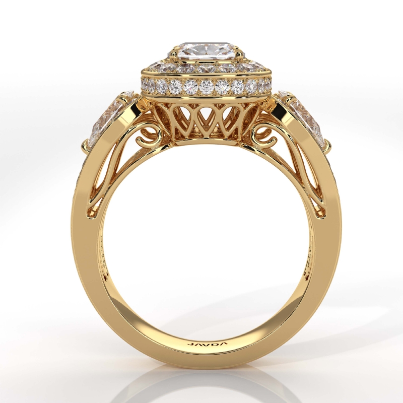 Circa Halo 3 Stone Filigree style Engagement Ring, center is Cushion shape Diamond Report by IGI, E Color & VS1 clarity, Made in 18k Yellow Gold (3.22 ct. tw.)