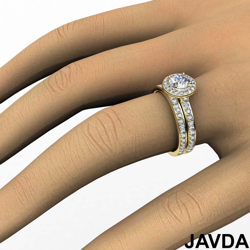 Halo Micropave Bridal Set style Engagement Ring, center is Round shape Diamond Report by GIA, E Color & VVS1 clarity, Made in 18k Yellow Gold (1.45 ct. tw.)