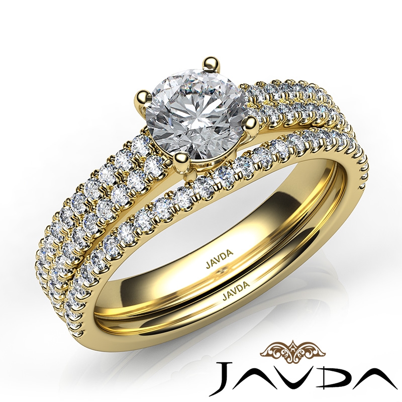 2 Row French Pave Bridal Set style Engagement Ring, center is Round shape Diamond Report by GIA, F Color & VS2 clarity, Made in 18k Yellow Gold (1.3 ct. tw.)