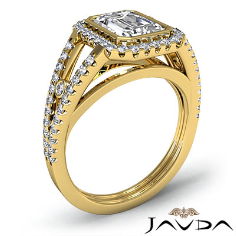 Bezel Halo Prong Setting style Engagement Ring, center is Emerald shape Diamond Report by GIA, E Color & VVS2 clarity, Made in 14k Yellow Gold (1.33 ct. tw.)