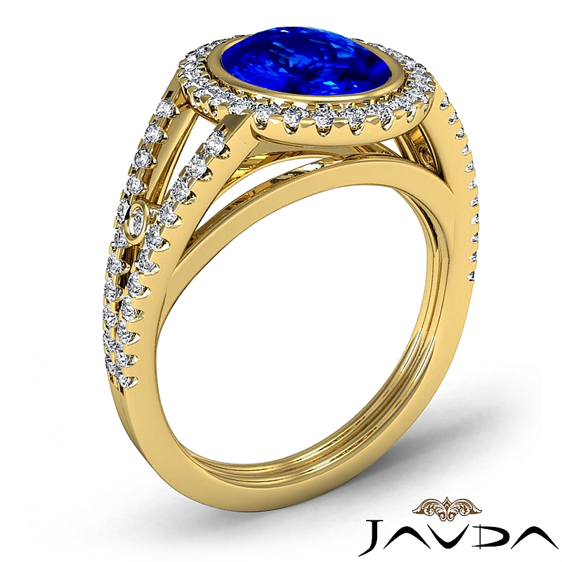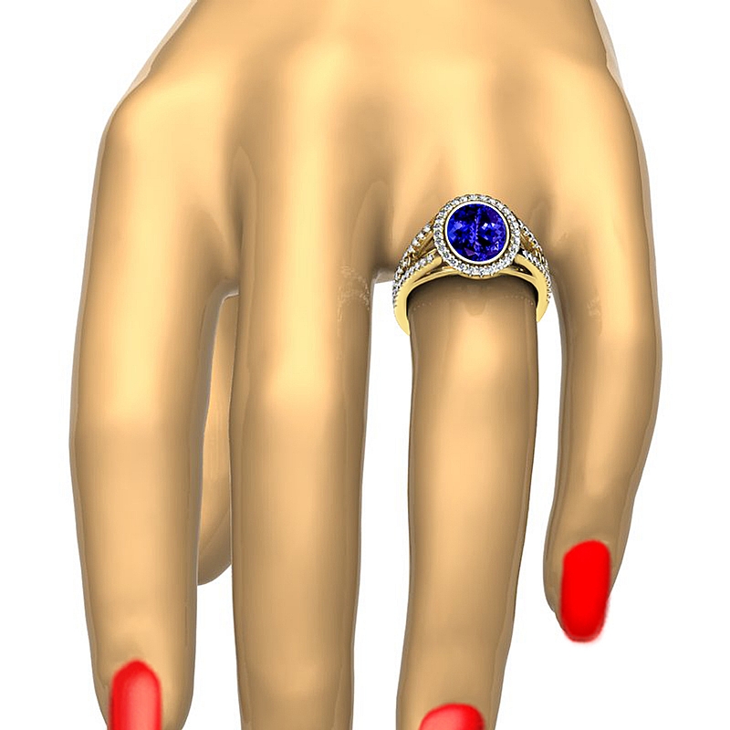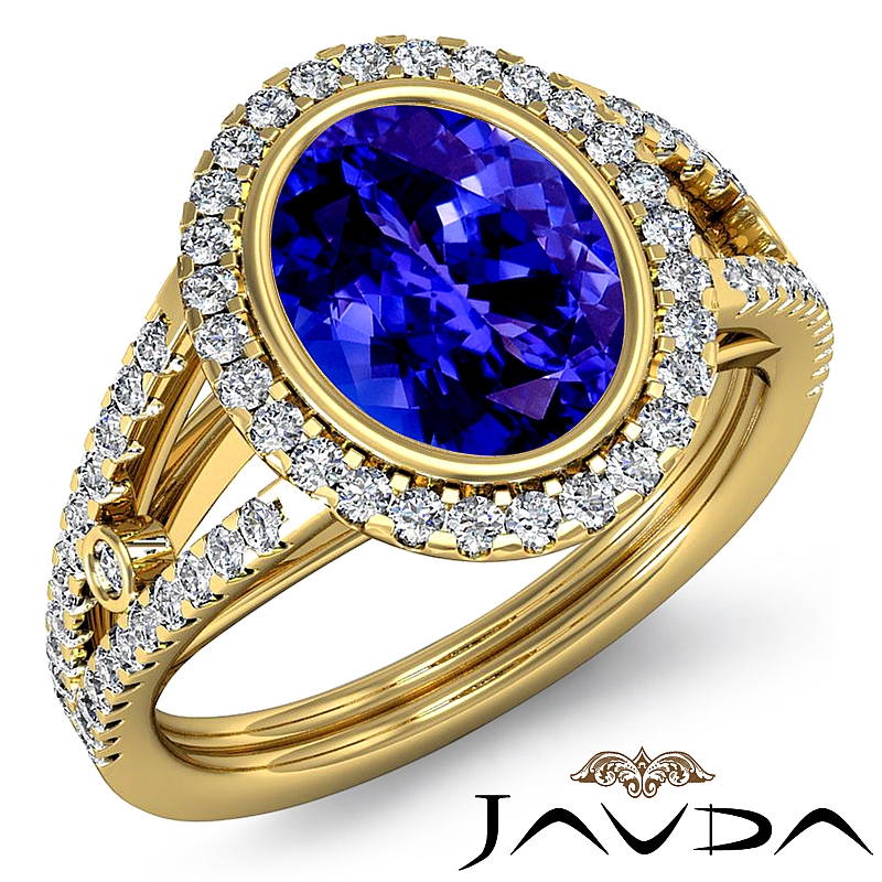 Bezel Halo Prong Setting style Engagement Ring, center is Oval shape D Block Tanzanite Report by , Color & clarity, Made in 18k Yellow Gold (1.8 ct. tw.)