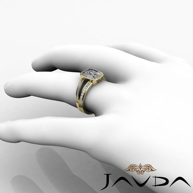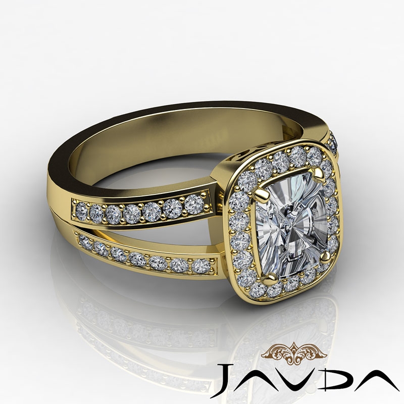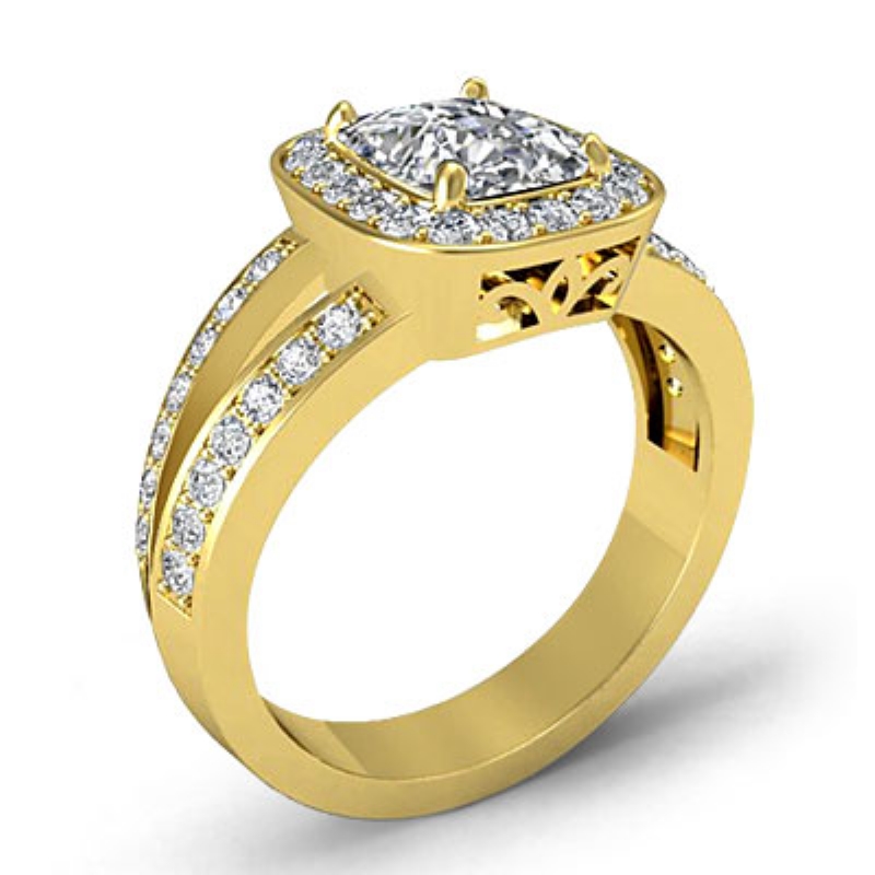 Split Shank Halo Pave Set style Engagement Ring, center is Cushion shape Diamond Report by GIA, H Color & SI1 clarity, Made in 18k Yellow Gold (1.35 ct. tw.)