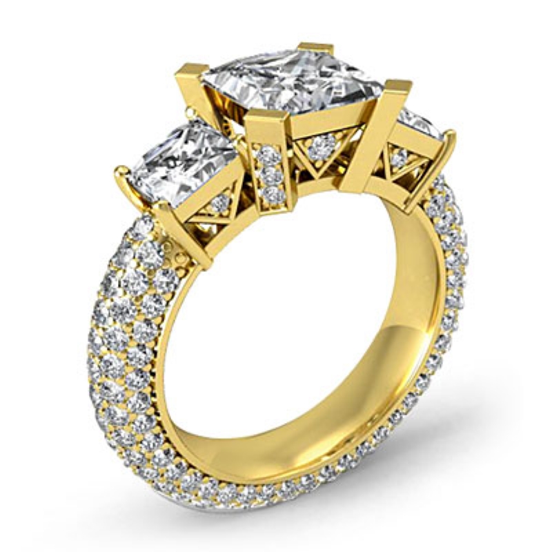 Vintage Style Micropave 3Stone style Engagement Ring, center is Princess shape Diamond Report by GIA, J Color & VS1 clarity, Made in 18k Yellow Gold (3.73 ct. tw.)