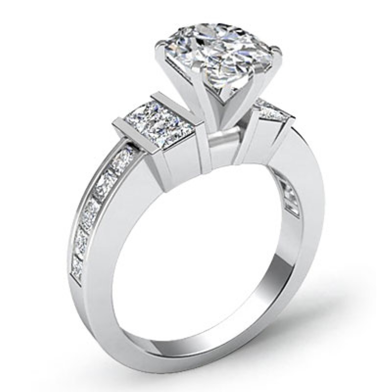 Channel Set Shank Prong style Engagement Ring, center is Oval shape Diamond Report by GIA, J Color & VS2 clarity, Made in 18k White Gold (1.6 ct. tw.)