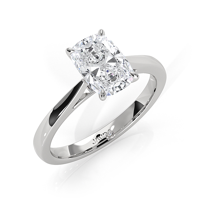 Cushion shape is diamond certified by GIA, 100% natural J color & VVS2 clarity {0.51 ctw.}.
