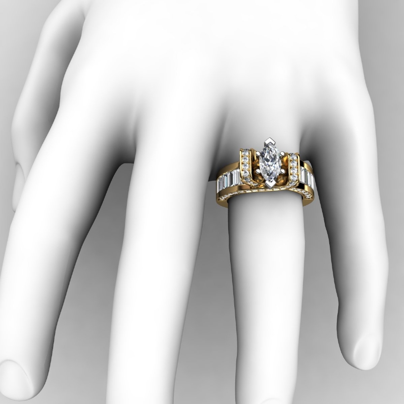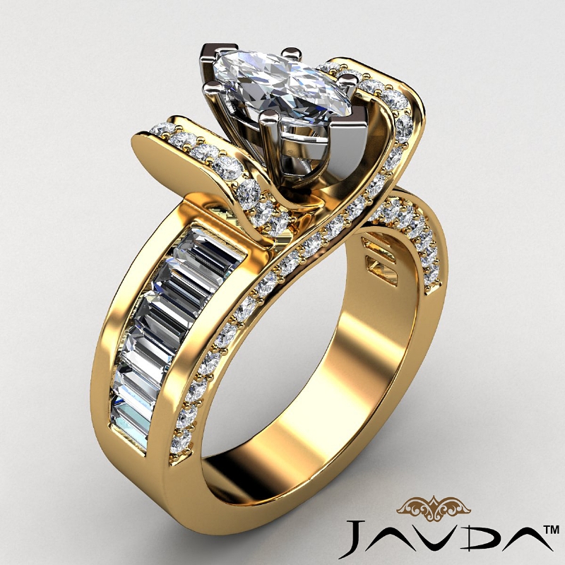 Baguette Channel Set 4 Prong style Engagement Ring, center is Marquise shape Diamond Report by GIA, I Color & SI1 clarity, Made in 18k Yellow Gold (2.95 ct. tw.)