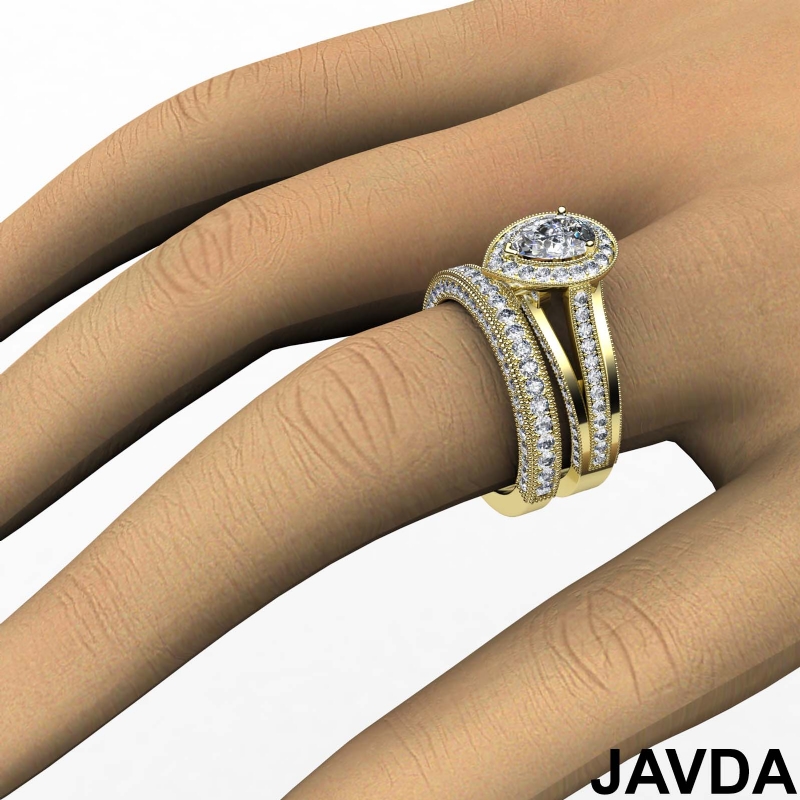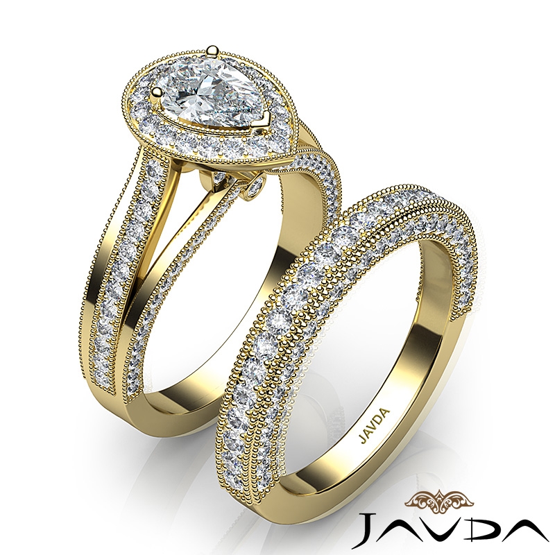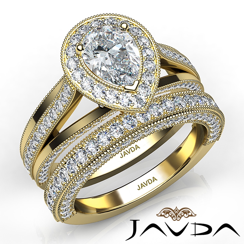 Pave Diamond Engagement Ring Bridal Sets 18k Yellow Gold Pear Semi Mount 1.7Ct.