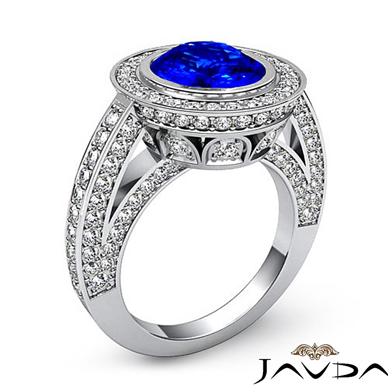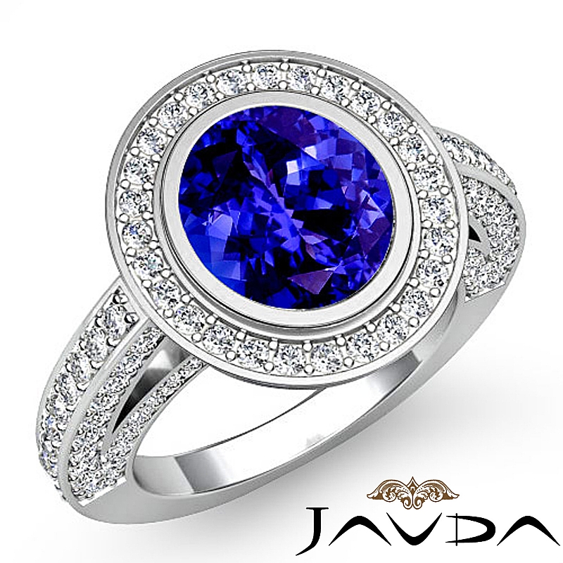 Halo Bezel Setting Sidestone style Engagement Ring, center is Oval shape D Block Tanzanite Report by , Color & clarity, Made in 18k White Gold (3 ct. tw.)