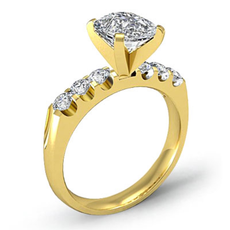 Classic 6 Stone Prong Shank style Engagement Ring, center is Cushion shape Diamond Report by GIA, E Color & VVS2 clarity, Made in 14k Yellow Gold (1.31 ct. tw.)