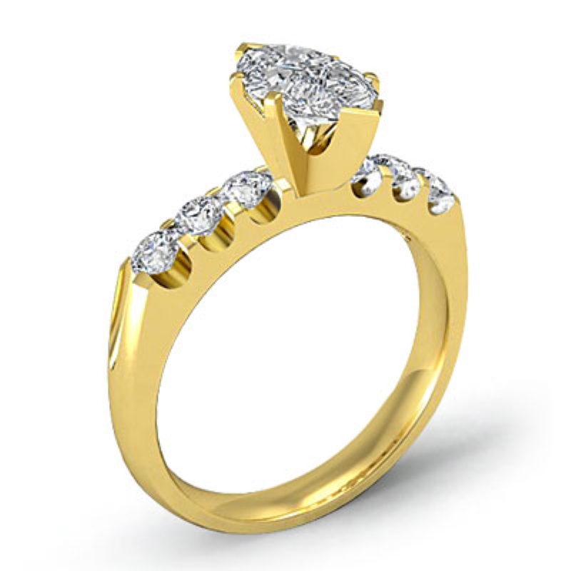 Classic 6 Stone Prong Shank style Engagement Ring, center is Marquise shape Diamond Report by IGI, E Color & VS1 clarity, Made in 18k Yellow Gold (3.06 ct. tw.)