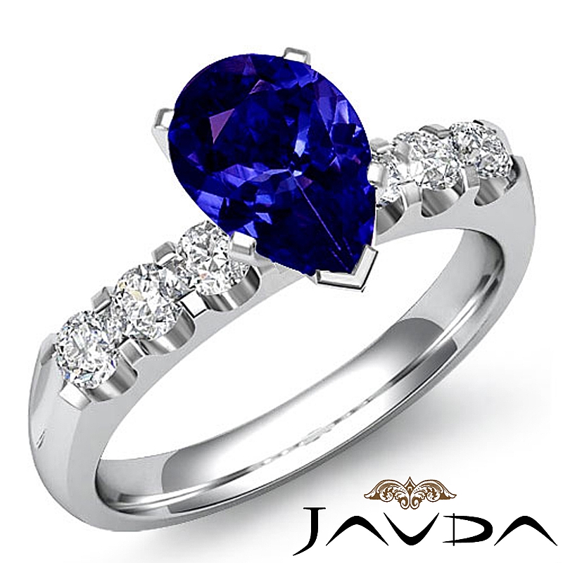 Classic 6 Stone Prong Shank style Engagement Ring, center is Pear shape D Block Tanzanite Report by , Color & clarity, Made in Platinum 950 (1.31 ct. tw.)