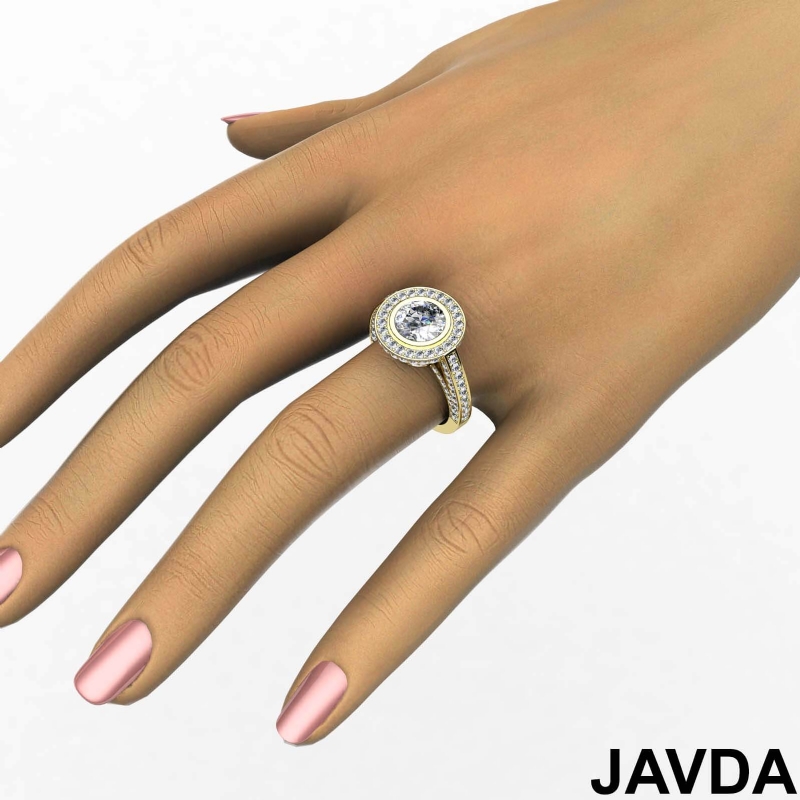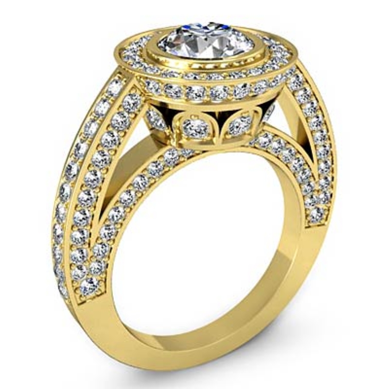 Bezel Set Halo Bridge Accent style Engagement Ring, center is Round shape Diamond Report by GIA, D Color & VS2 clarity, Made in 14k Yellow Gold (2.5 ct. tw.)