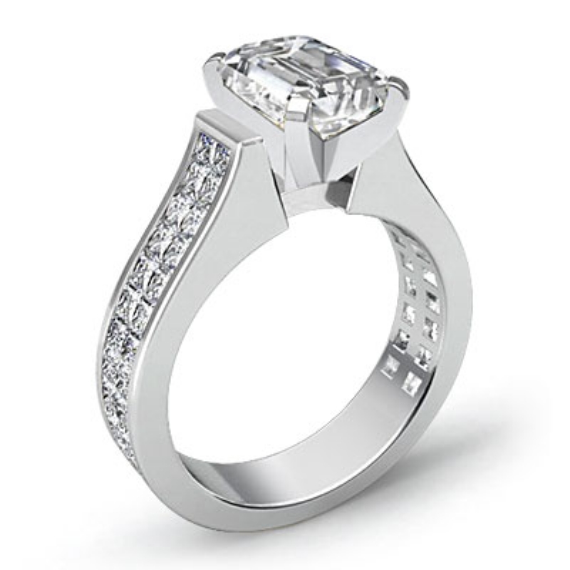 Invisible Shank Sidestone style Engagement Ring, center is Emerald shape Diamond Report by GIA, E Color & VS1 clarity, Made in Platinum 950 (3.02 ct. tw.)
