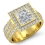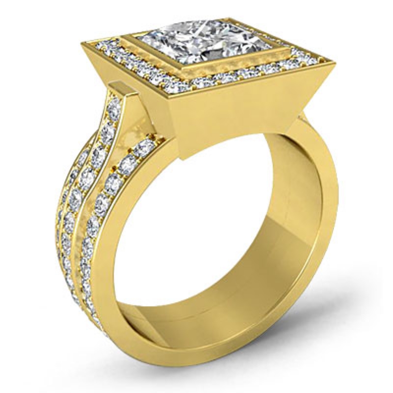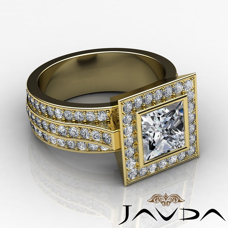 3 Row Shank Bezel Halo style Engagement Ring, center is Princess shape Diamond Report by GIA, J Color & VVS2 clarity, Made in 14k Yellow Gold (2.66 ct. tw.)