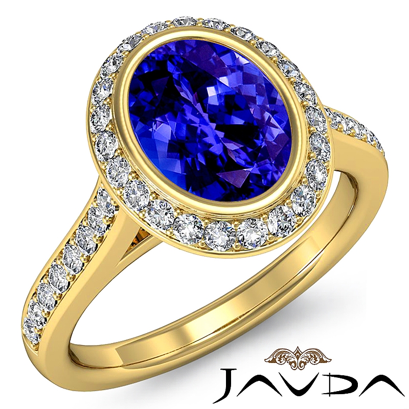 Bezel Set Halo Side Stone style Engagement Ring, center is Oval shape D Block Tanzanite Report by , Color & clarity, Made in 14k Yellow Gold (1.8 ct. tw.)