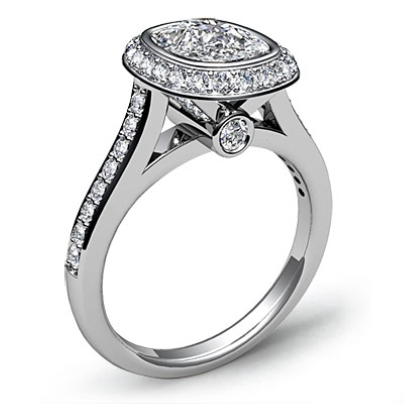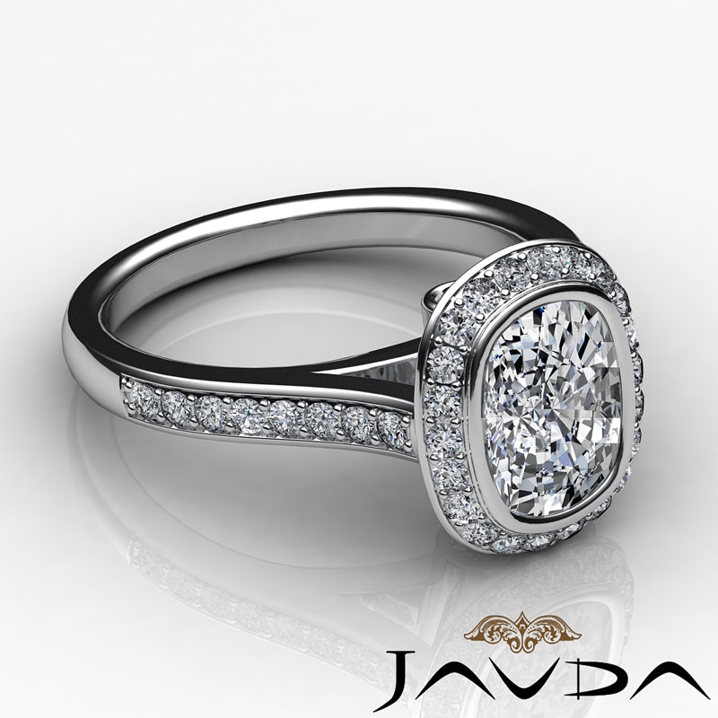 Bezel Set Halo Side Stone style Engagement Ring, center is Cushion shape Diamond Report by GIA, E Color & VVS2 clarity, Made in 18k White Gold (1.8 ct. tw.)