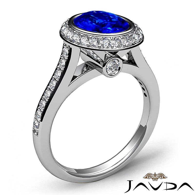 Bezel Set Halo Side Stone style Engagement Ring, center is Oval shape D Block Tanzanite Report by , Color & clarity, Made in 18k White Gold (1.8 ct. tw.)