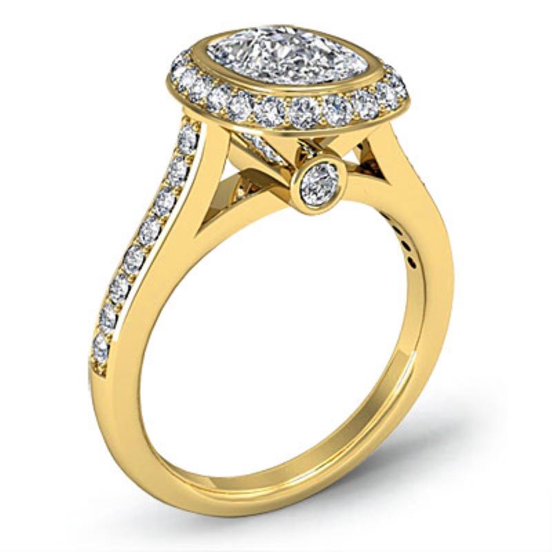 Bezel Set Halo Side Stone style Engagement Ring, center is Cushion shape Diamond Report by GIA, E Color & VVS2 clarity, Made in 18k Yellow Gold (1.8 ct. tw.)