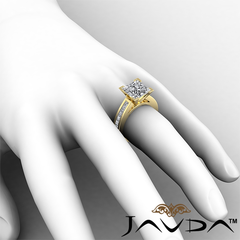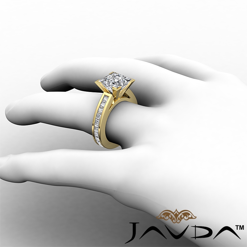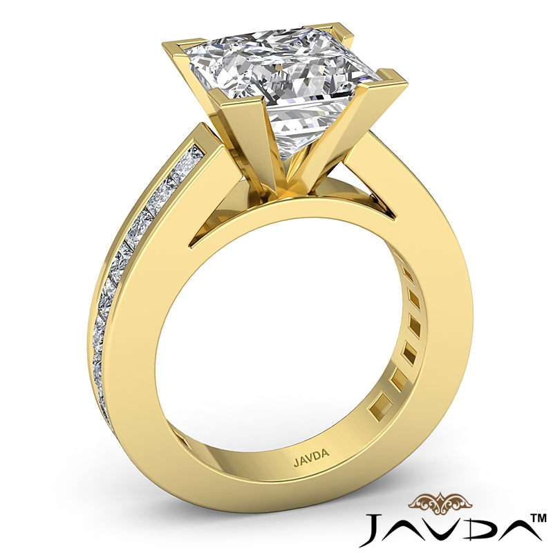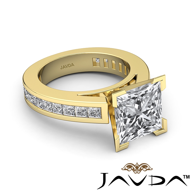 Channel Set Cathedral 4 Prong style Engagement Ring, center is Princess shape Diamond Report by IGI, D Color & VS1 clarity, Made in 14k Yellow Gold (4.33 ct. tw.)