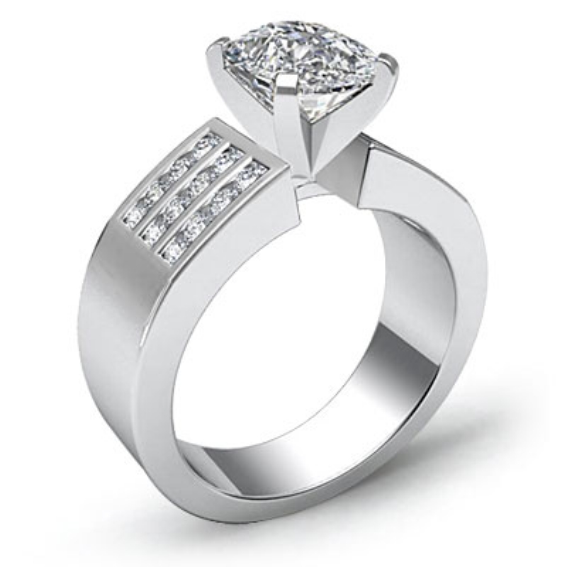 Channel Set Sidestone style Engagement Ring, center is Cushion shape Diamond Report by GIA, D Color & VS1 clarity, Made in 18k White Gold (0.81 ct. tw.)