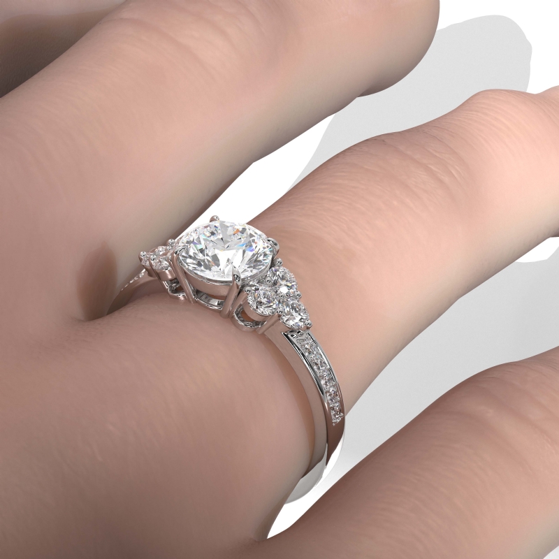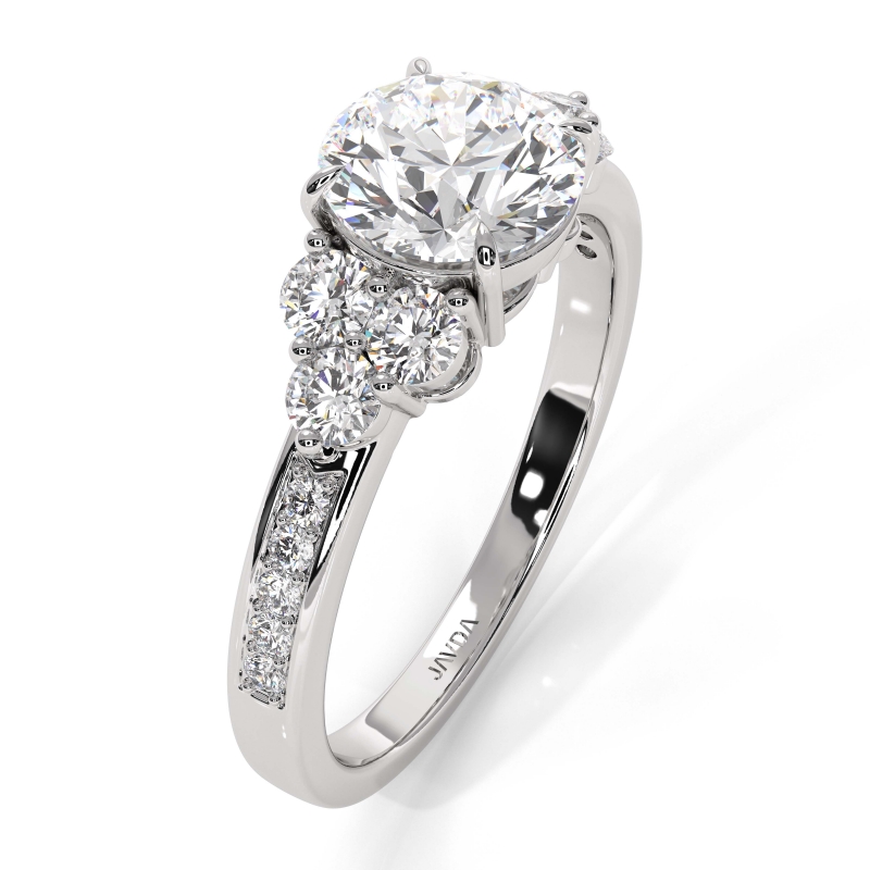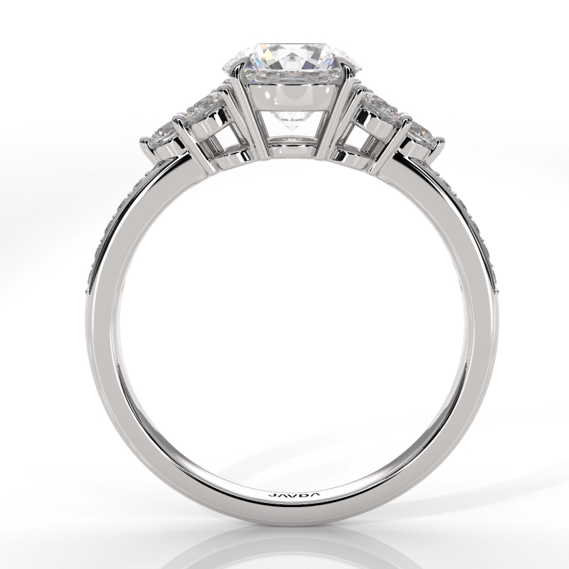 Three Stone Pave Sidestone style Engagement Ring, center is Round shape Diamond Report by GIA, I Color & SI1 clarity, Made in 18k White Gold (1.23 ct. tw.)