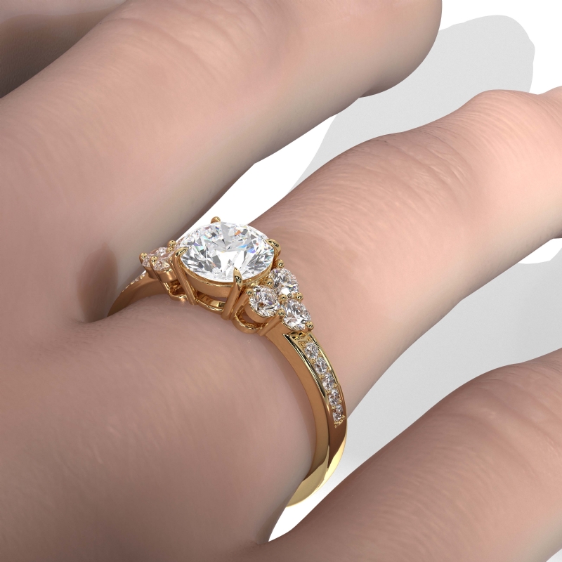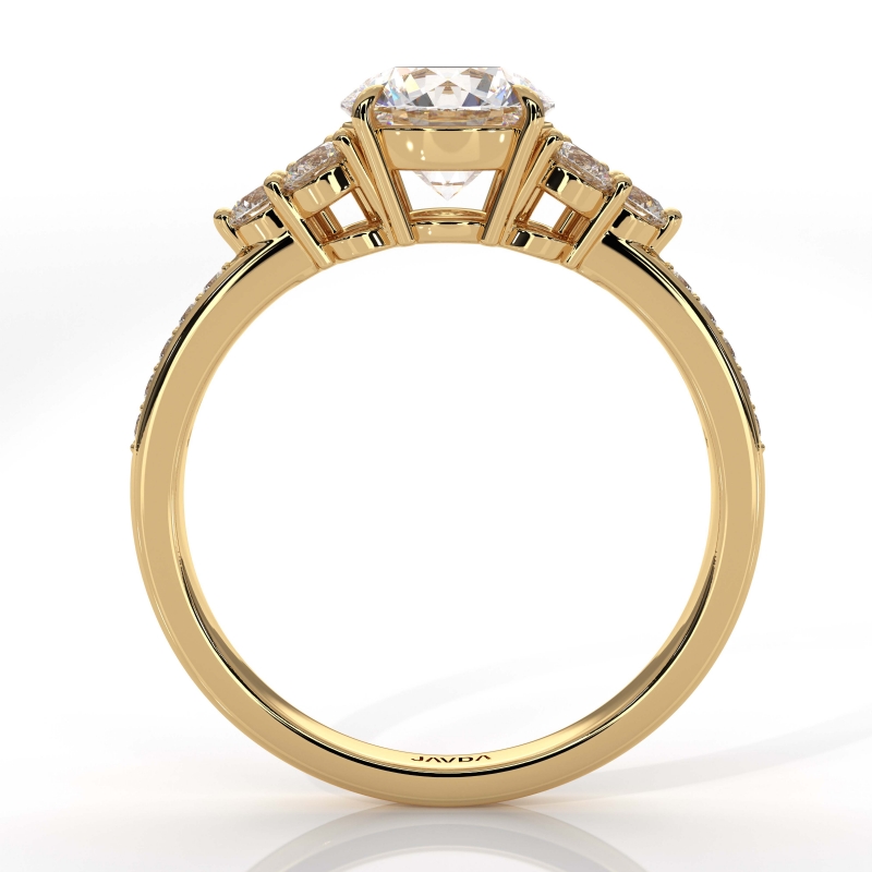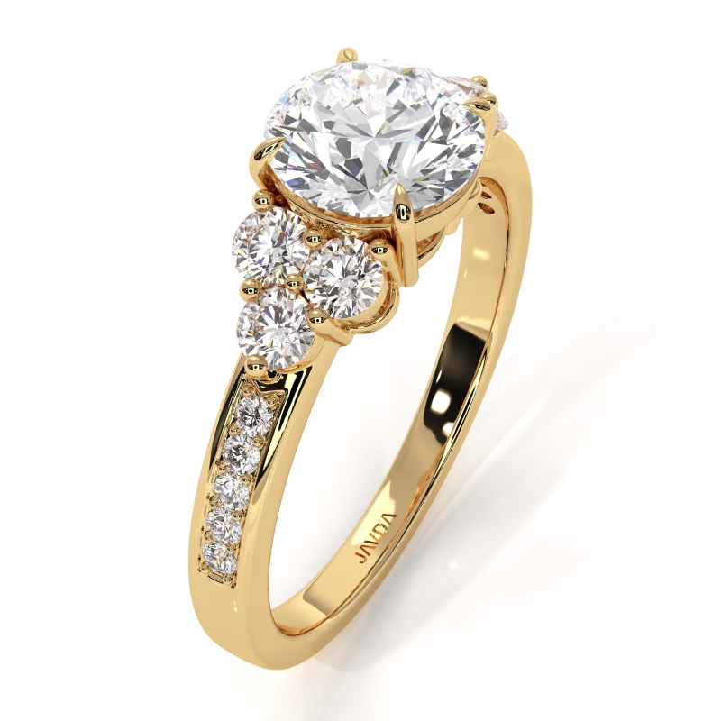 Three Stone Pave Sidestone style Engagement Ring, center is Round shape Diamond Report by GIA, I Color & SI1 clarity, Made in 18k Yellow Gold (1.3 ct. tw.)