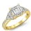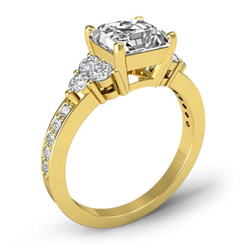 Three Stone Pave Sidestone style Engagement Ring, center is Asscher shape Diamond Report by IGI, D Color & VS1 clarity, Made in 18k Yellow Gold (1.58 ct. tw.)