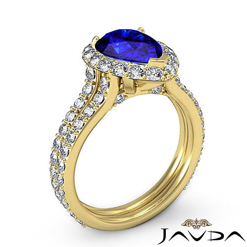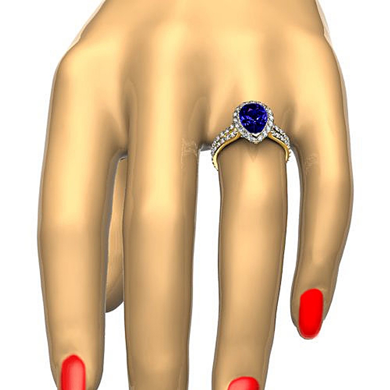 Halo Pave Set Split Shank style Engagement Ring, center is Pear shape D Block Tanzanite Report by , Color & clarity, Made in 18k Yellow Gold (2.3 ct. tw.)