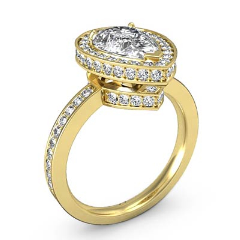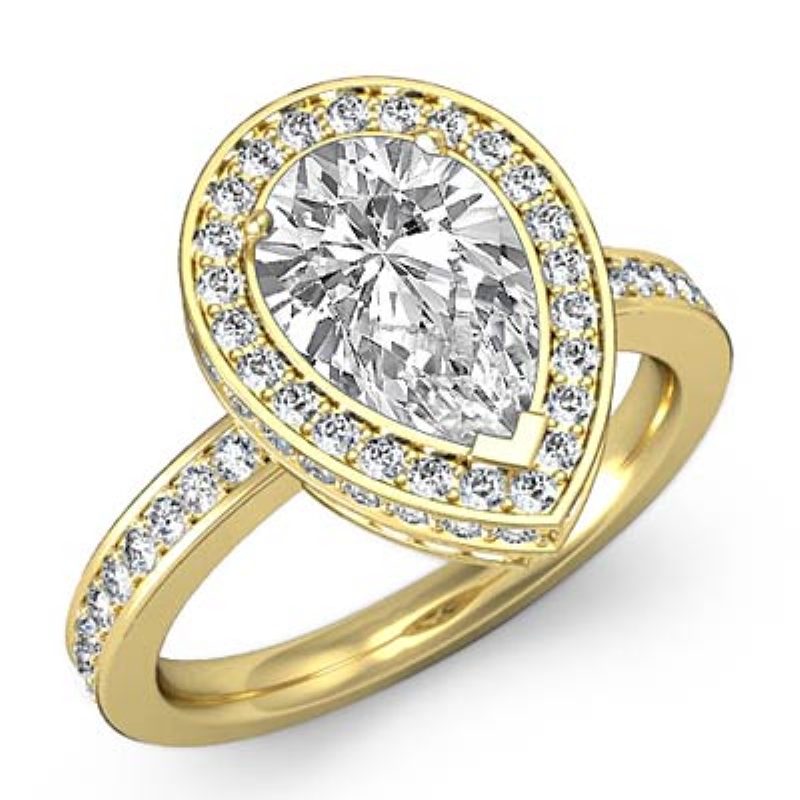 Halo Sidestone Pave Set style Engagement Ring, center is Pear shape Diamond Report by GIA, I Color & SI2 clarity, Made in 14k Yellow Gold (1.96 ct. tw.)