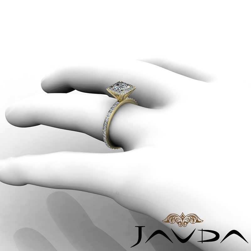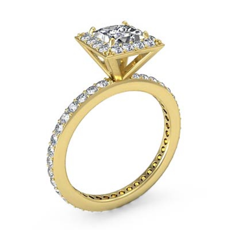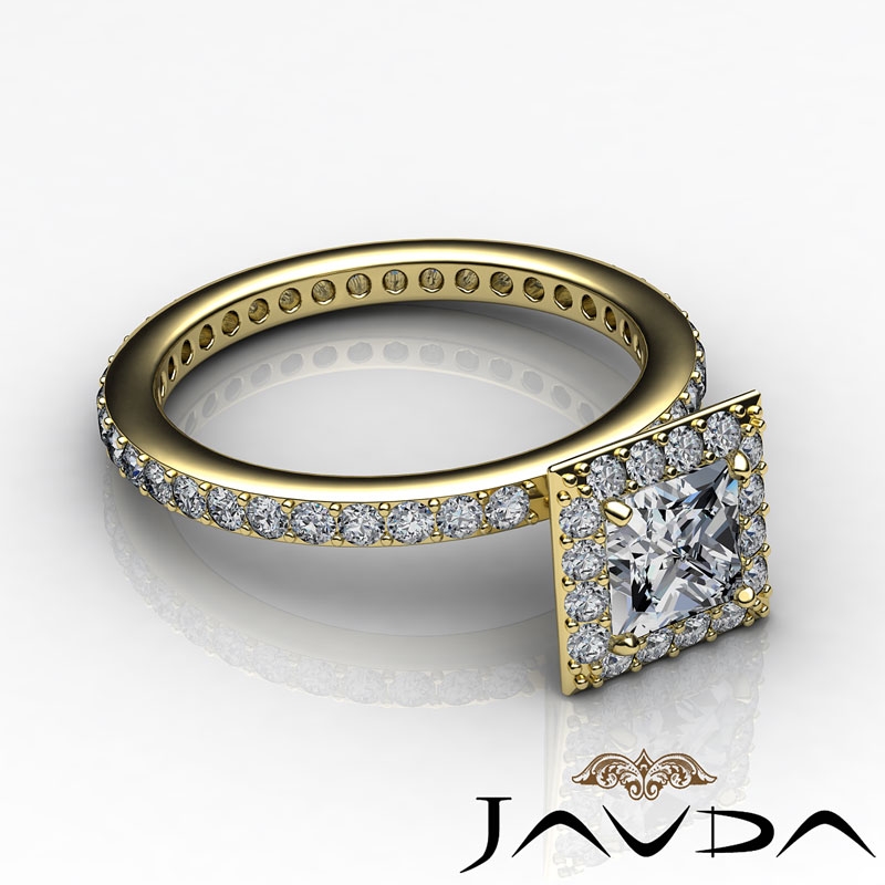 Halo Pave Setting Eternity style Engagement Ring, center is Princess shape Diamond Report by GIA, J Color & VS1 clarity, Made in 18k Yellow Gold (1.48 ct. tw.)