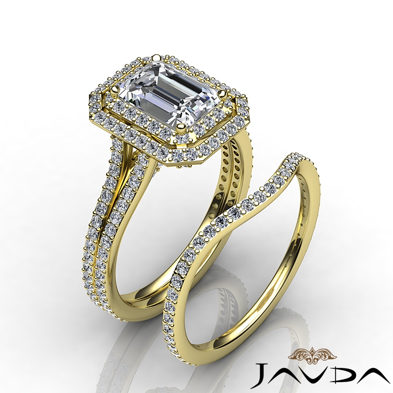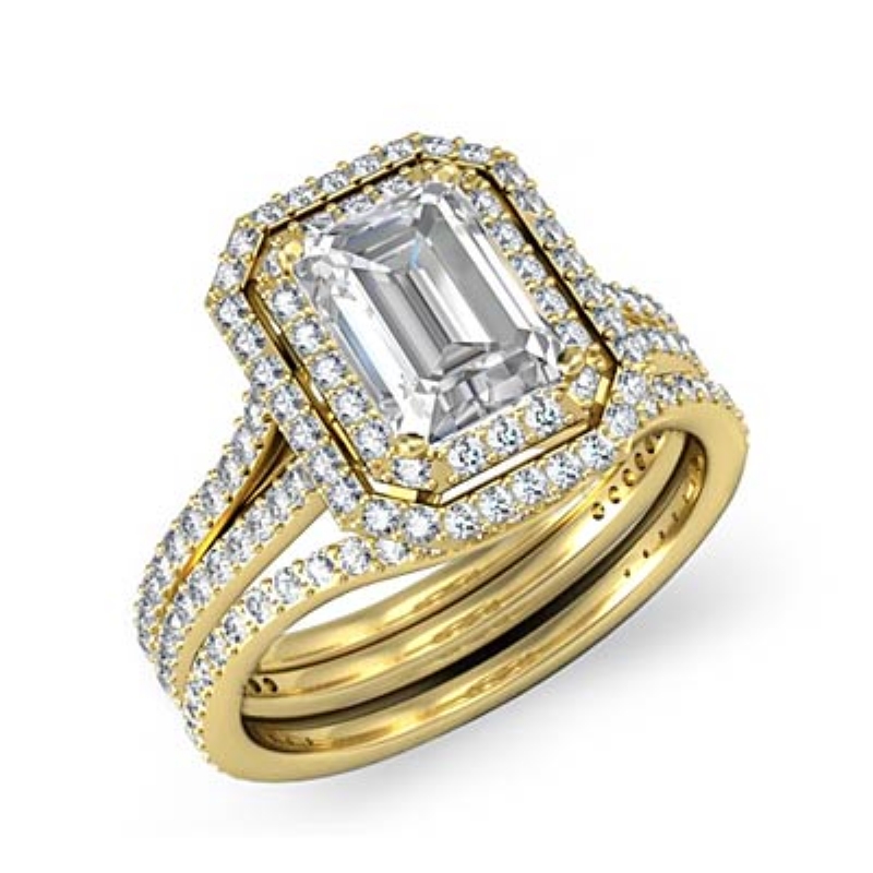 Gala Halo Pave Set Bridal style Engagement Ring, center is Emerald shape Diamond Report by GIA, J Color & VVS1 clarity, Made in 18k Yellow Gold (2.62 ct. tw.)