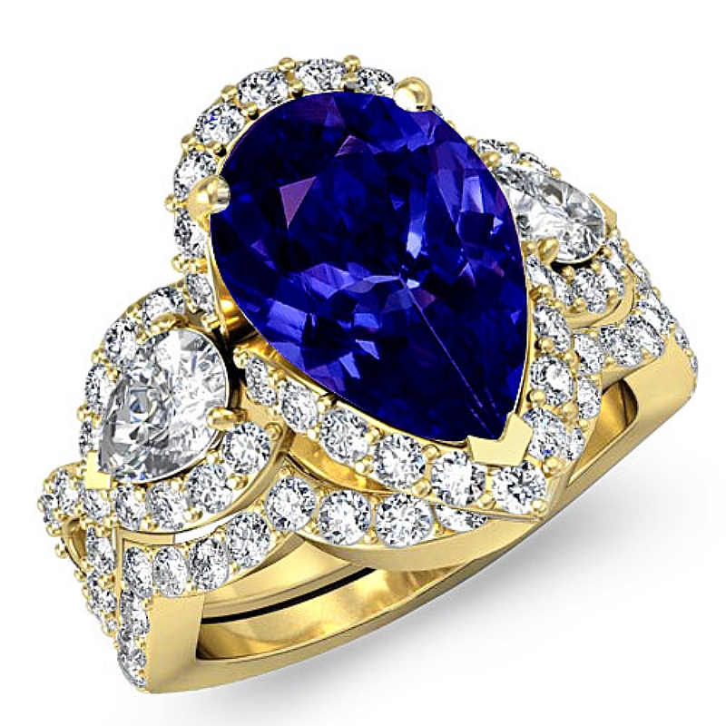 3 Stone Bridal Ring Sets style Engagement Ring, center is Pear shape D Block Tanzanite Report by , Color & clarity, Made in 18k Yellow Gold (3.08 ct. tw.)