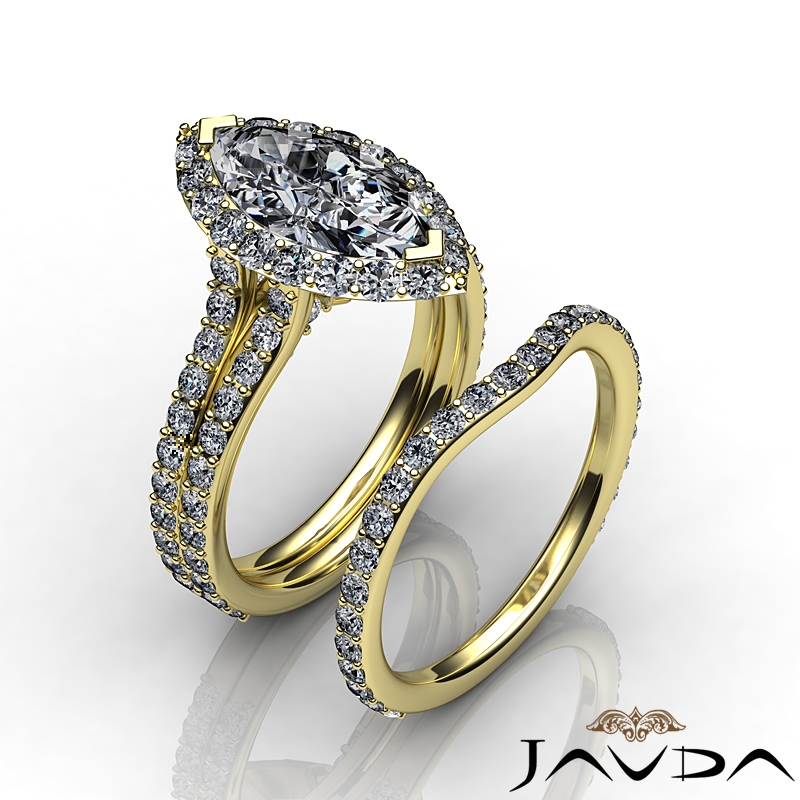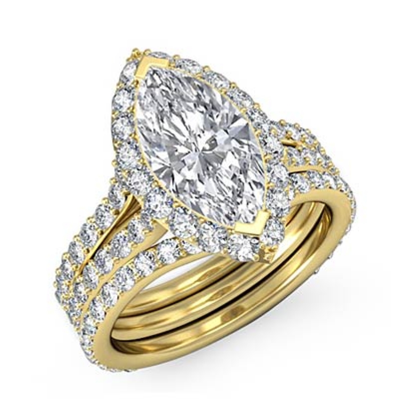 Split Shank Halo Bridal Sets style Engagement Ring, center is Marquise shape Diamond Report by GIA, I Color & SI1 clarity, Made in 14k Yellow Gold (2.85 ct. tw.)