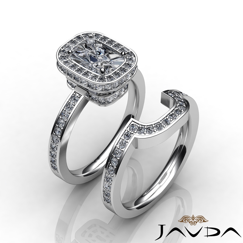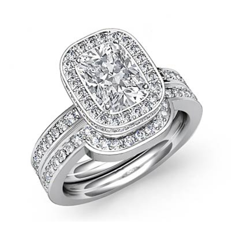 Accent Halo Bridal Set style Engagement Ring, center is Cushion shape Diamond Report by GIA, J Color & VS2 clarity, Made in 18k White Gold (2.38 ct. tw.)