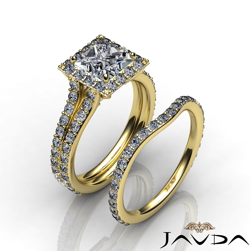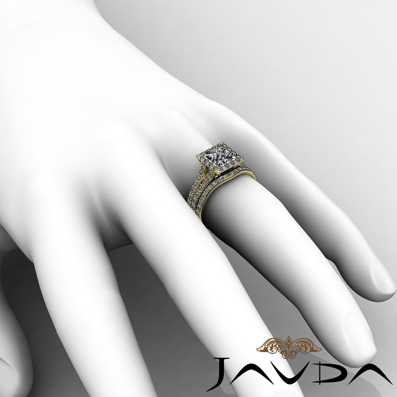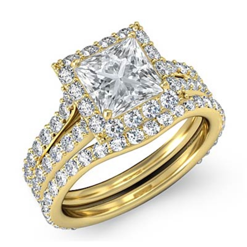 Bridal Split Shank Halo style Engagement Ring, center is Princess shape Diamond Report by GIA, J Color & VS1 clarity, Made in 14k Yellow Gold (2.81 ct. tw.)