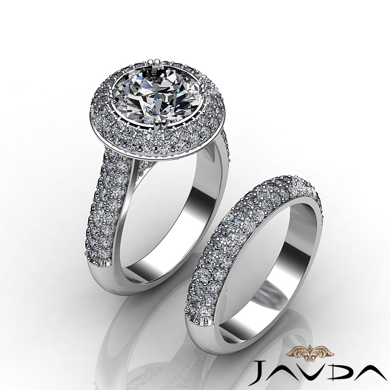 Duet Halo Pave Bridal Set style Engagement Ring, center is Round shape Diamond Report by GIA, I Color & SI1 clarity, Made in 18k White Gold (3.5 ct. tw.)