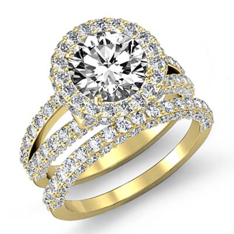 Halo Split Shank Bridal Set style Engagement Ring, center is Round shape Diamond Report by GIA, I Color & SI1 clarity, Made in 18k Yellow Gold (3.28 ct. tw.)