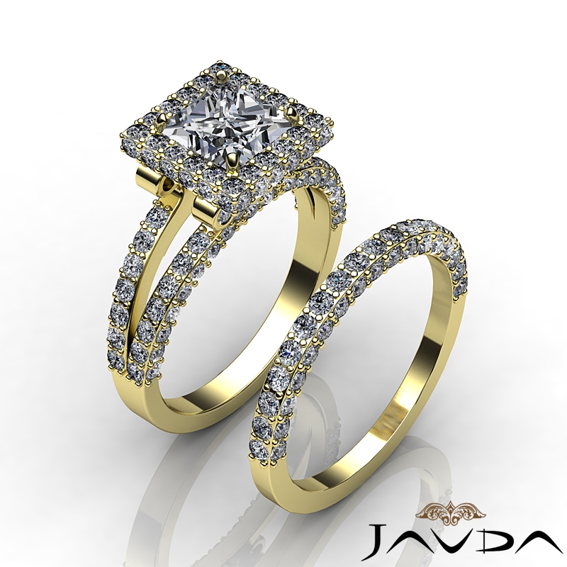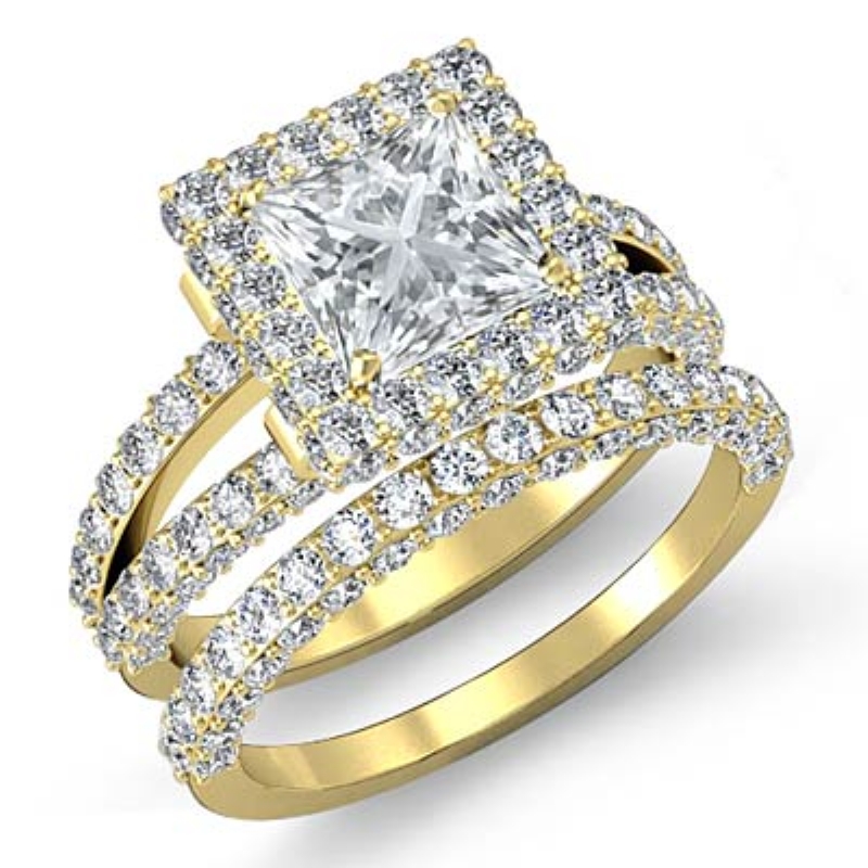 Halo Bridal Set Sidestone style Engagement Ring, center is Princess shape Diamond Report by GIA, I Color & VS2 clarity, Made in 14k Yellow Gold (3.68 ct. tw.)