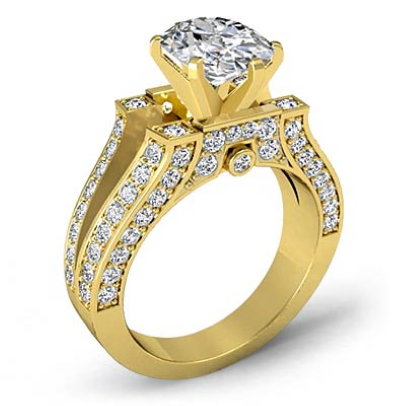 Vintage Split Shank Pave style Engagement Ring, center is Oval shape Diamond Report by IGI, F Color & VS1 clarity, Made in 18k Yellow Gold (2.2 ct. tw.)
