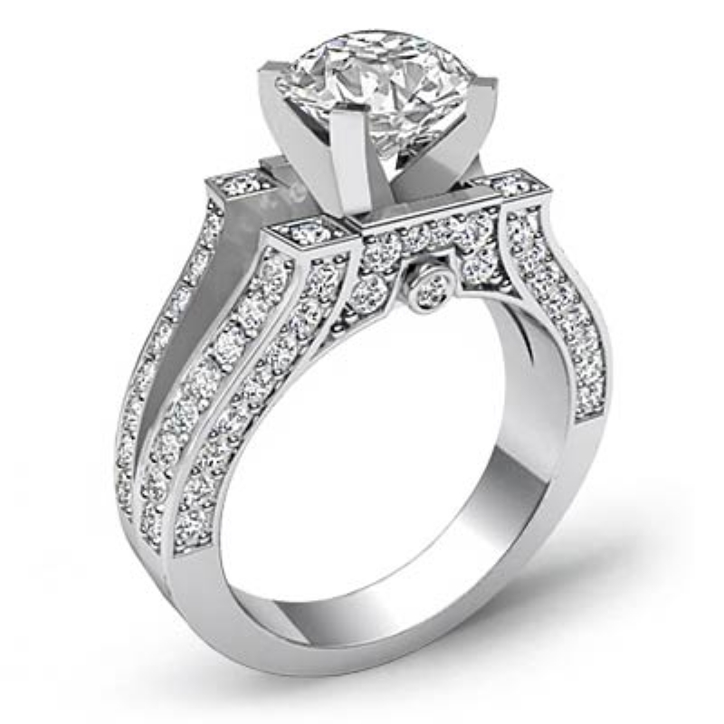 Vintage Split Shank Pave style Engagement Ring, center is Round shape Diamond Report by GIA, I Color & SI1 clarity, Made in Platinum 950 (2.2 ct. tw.)
