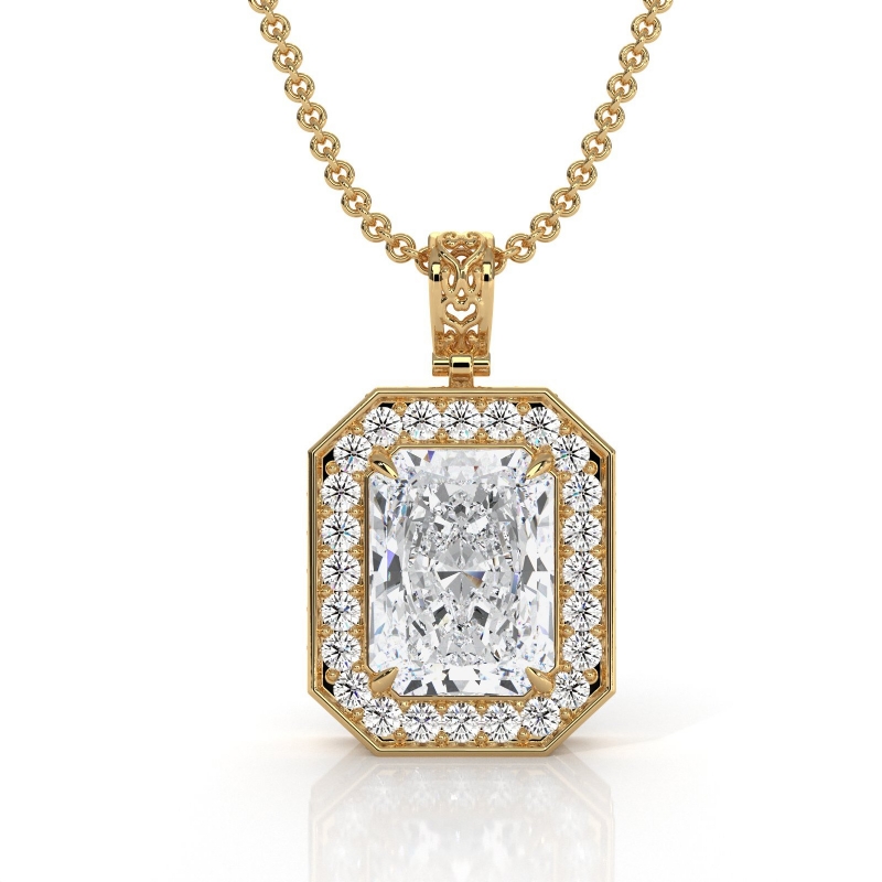 Pave Set Diamond Halo Radiant Cut Solitaire Pendant in 14k Yellow Gold 0.61Ct.