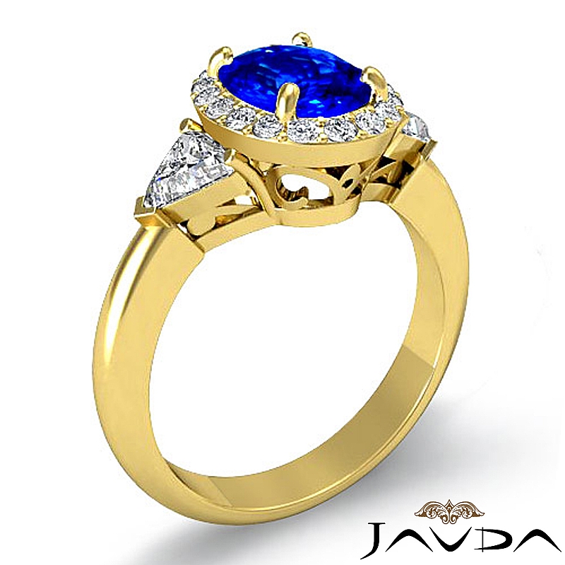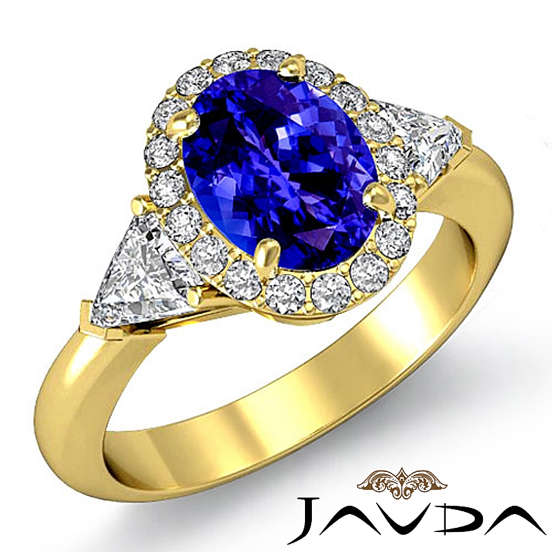 Three Stone Trillion Halo style Engagement Ring, center is Oval shape D Block Tanzanite Report by , Color & clarity, Made in 14k Yellow Gold (2 ct. tw.)