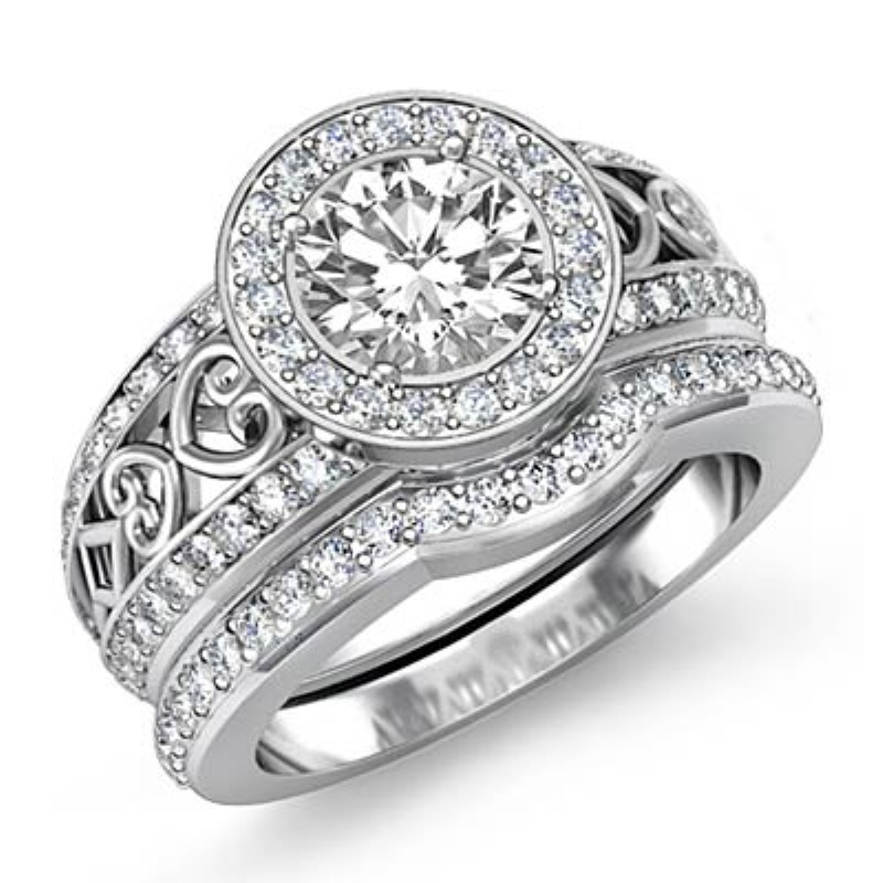 Filigree Shank Halo Bridal style Engagement Ring, center is Round shape Diamond Report by GIA, I Color & SI1 clarity, Made in 18k White Gold (2.52 ct. tw.)