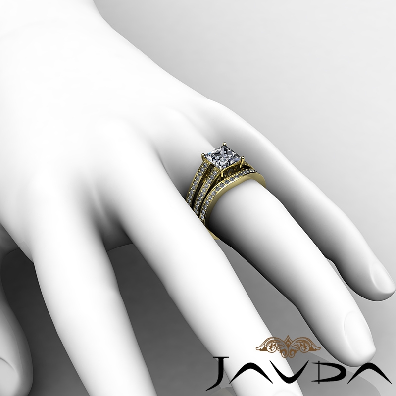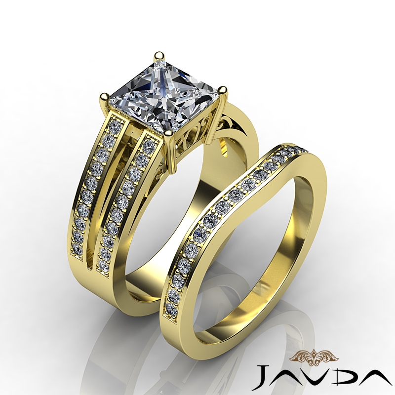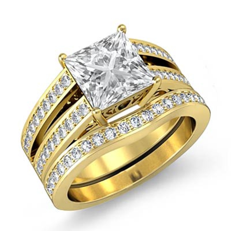Pave Split Shank Bridal Set style Engagement Ring, center is Princess shape Diamond Report by GIA, H Color & VS2 clarity, Made in 14k Yellow Gold (2.25 ct. tw.)