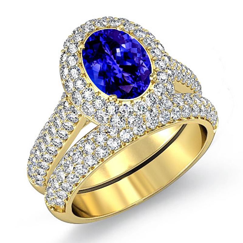 Double Halo Bridal Set Pave style Engagement Ring, center is Oval shape D Block Tanzanite Report by , Color & clarity, Made in 14k Yellow Gold (4 ct. tw.)