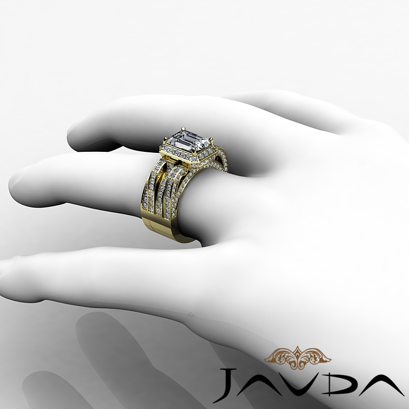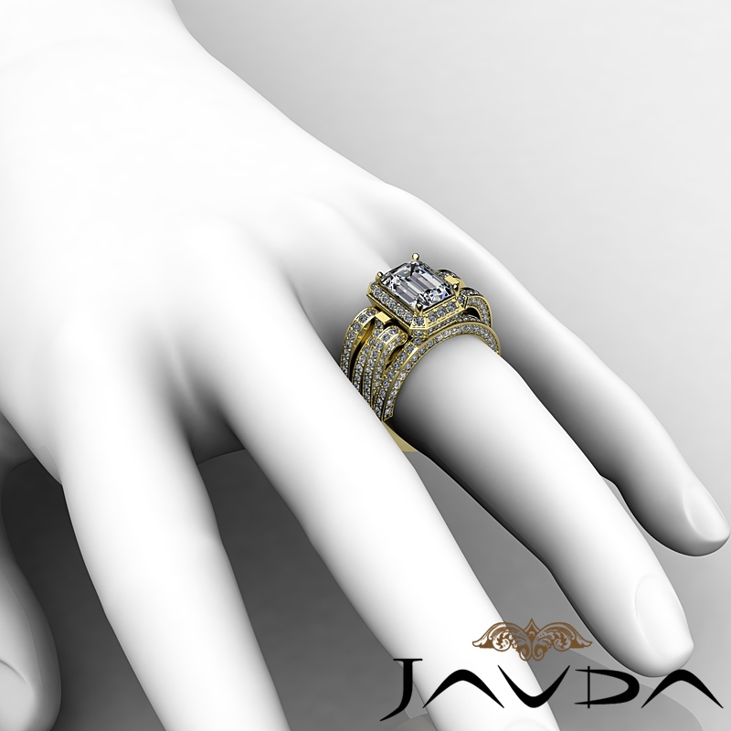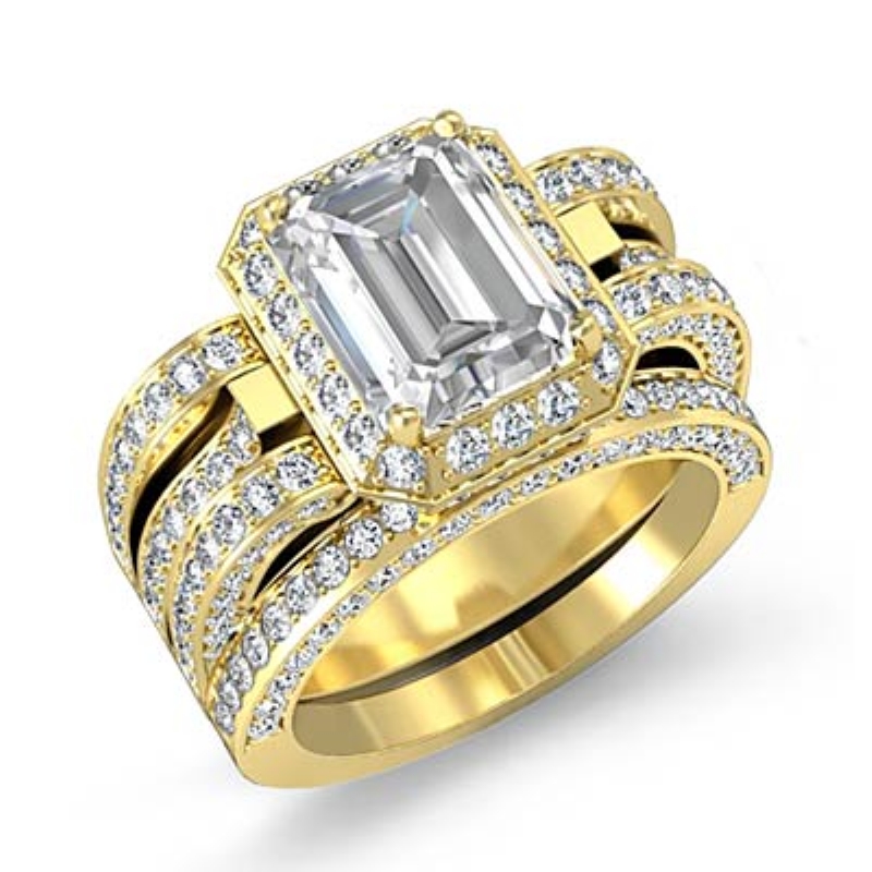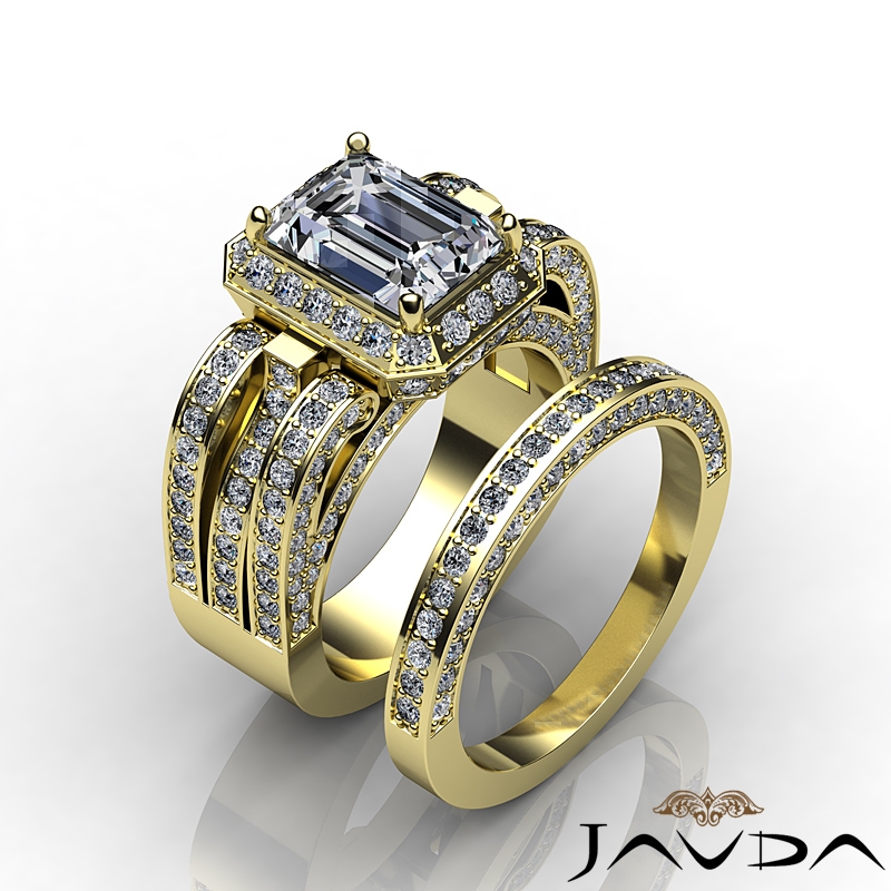Halo Pave Vintage Bridal Set style Engagement Ring, center is Emerald shape Diamond Report by IGI, D Color & VS1 clarity, Made in 18k Yellow Gold (7.7 ct. tw.)