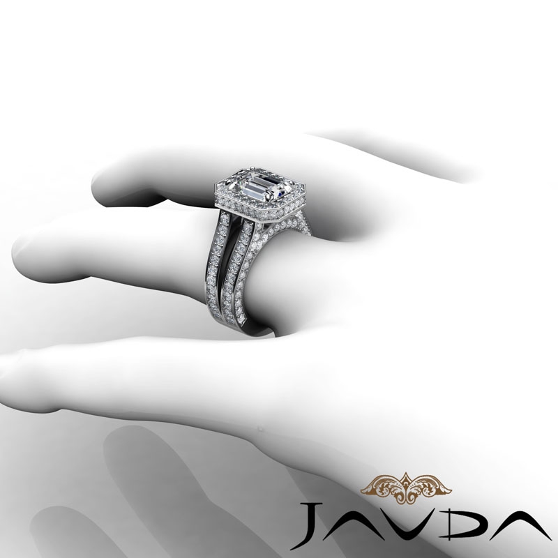 Pave Set Circa Halo Bridge style Engagement Ring, center is Emerald shape Diamond Report by GIA, D Color & IF clarity, Made in Platinum 950 (3.02 ct. tw.)