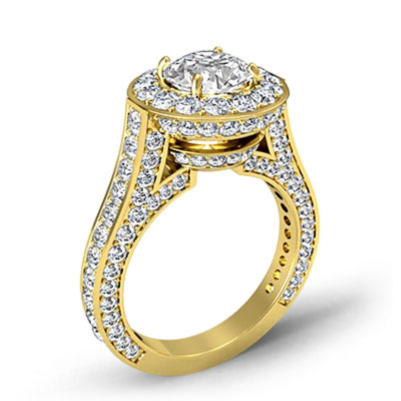 Halo Micro Pave Bridge Accent style Engagement Ring, center is Round shape Diamond Report by IGI, D Color & VS1 clarity, Made in 14k Yellow Gold (3.14 ct. tw.)